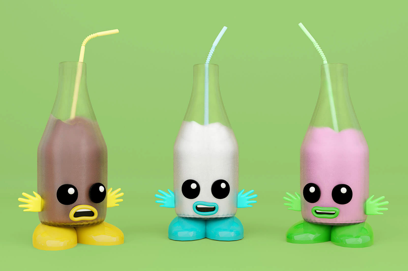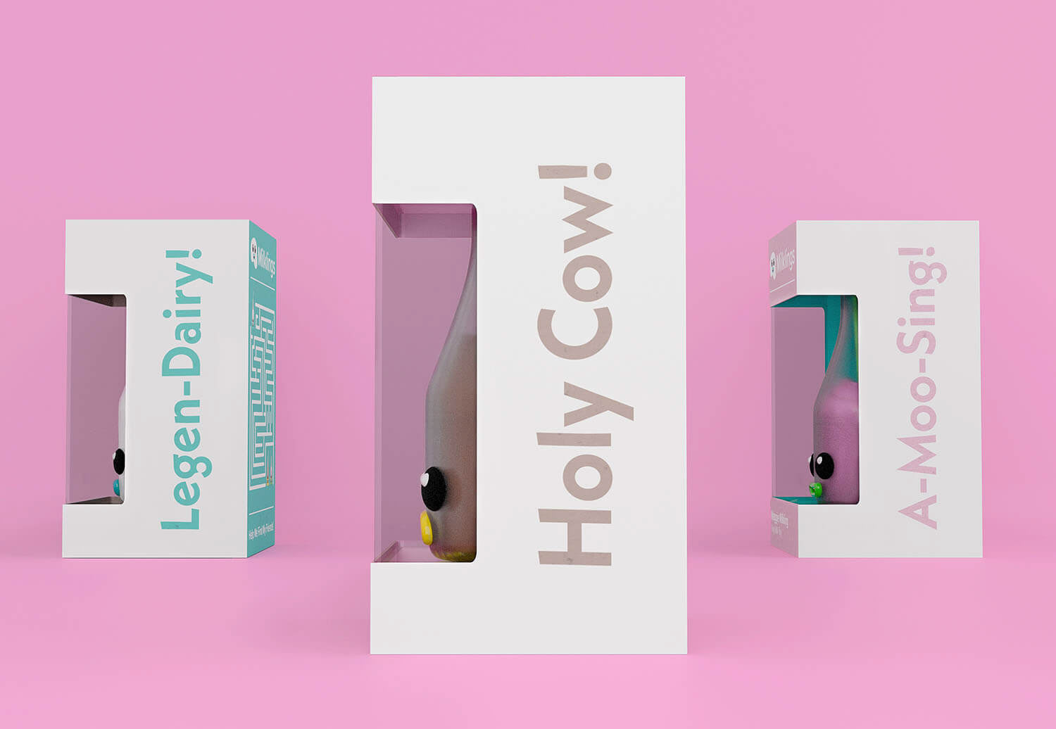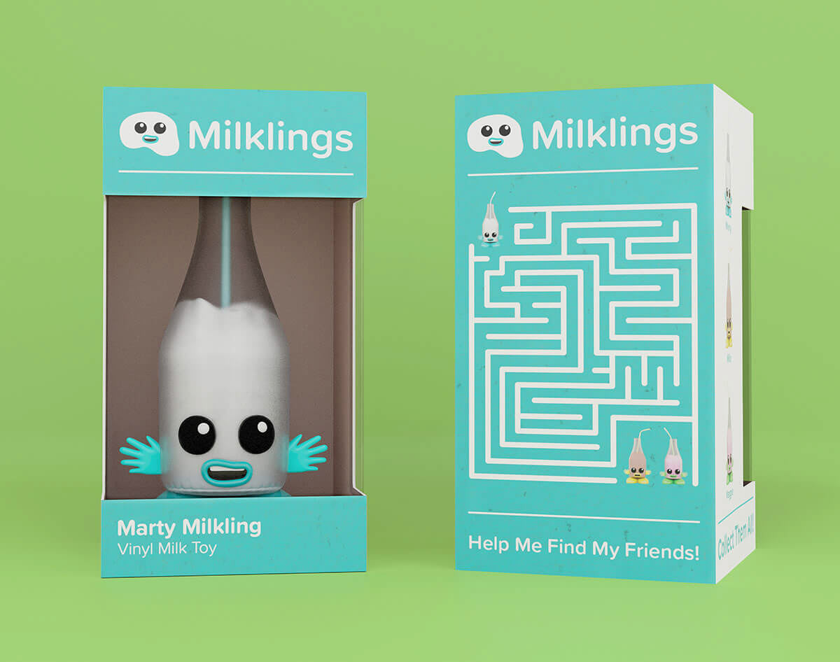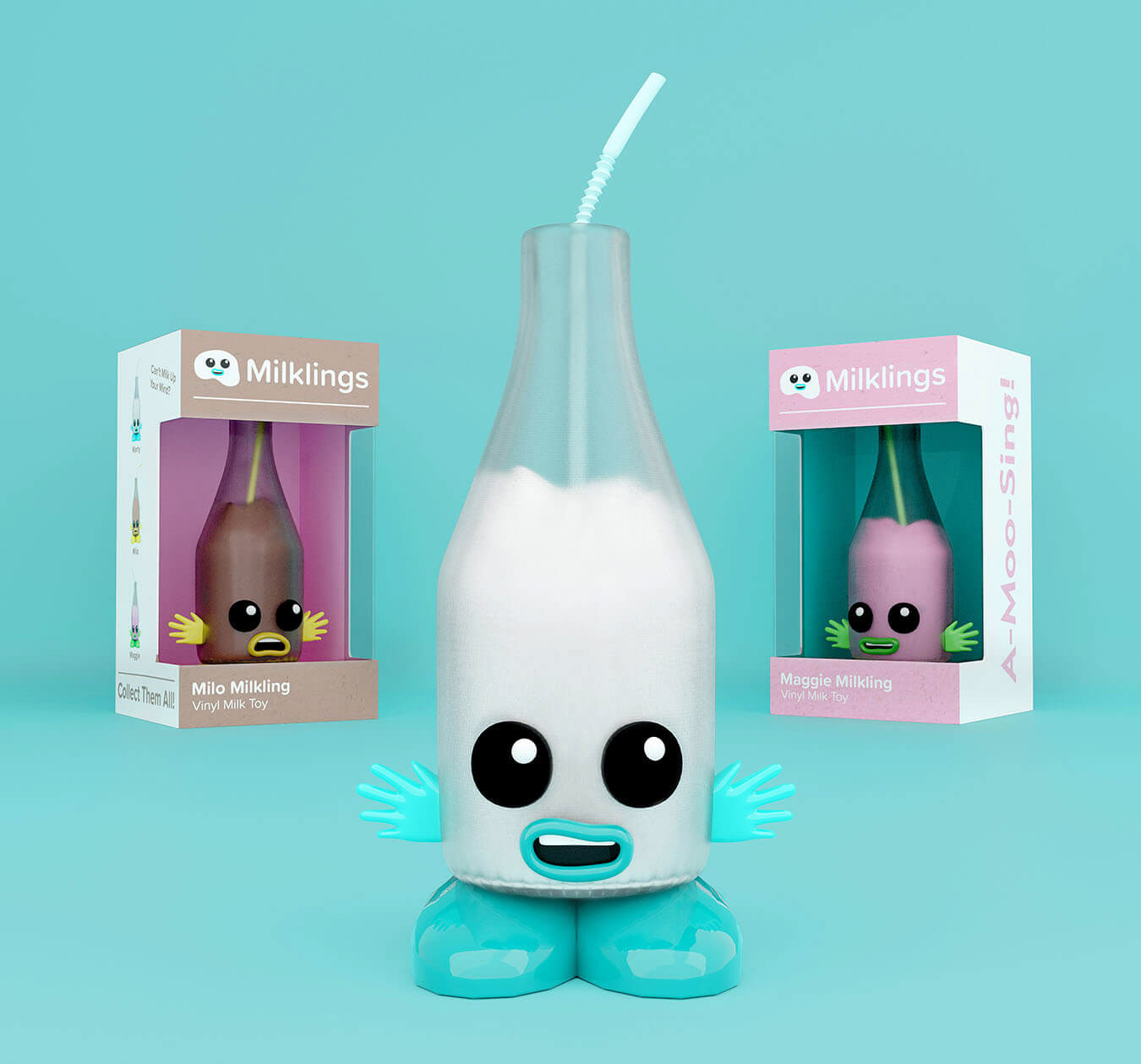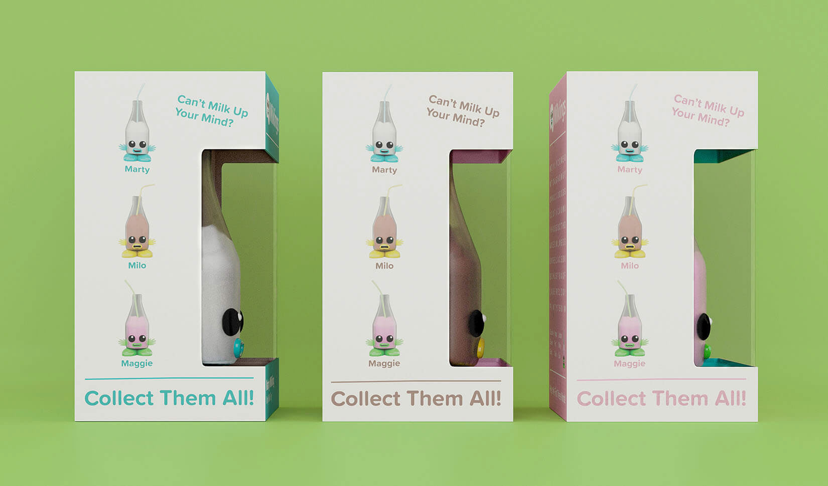 Collectible vinyl milk bottle toys and packaging created to encourage children to drink their milk.